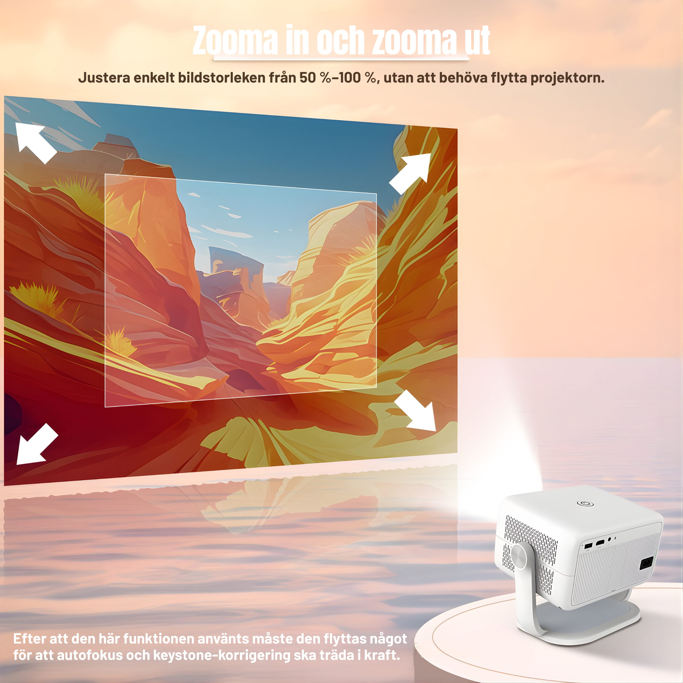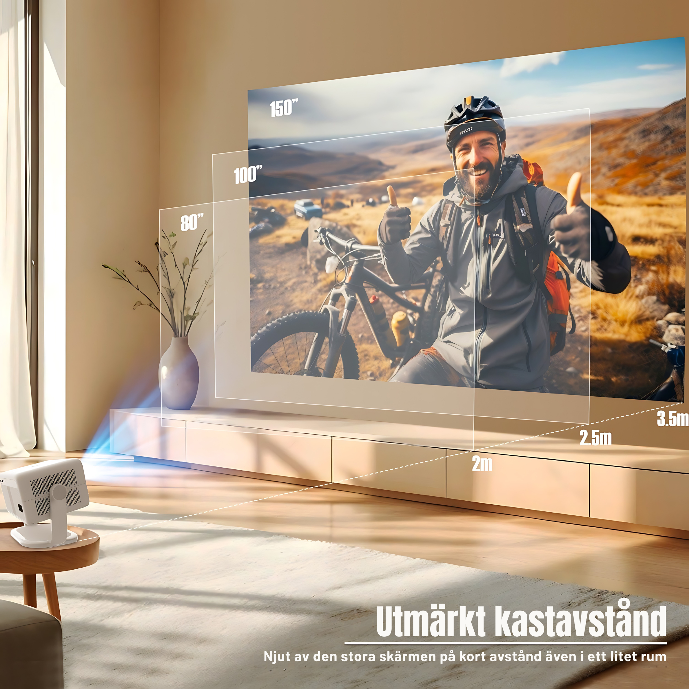 Det beror på modellen, men våra projektorer klarar vanligtvis 30–150 tum. Den bästa bildstorleken styrs av avståndet mellan projektorn och väggen eller duken.