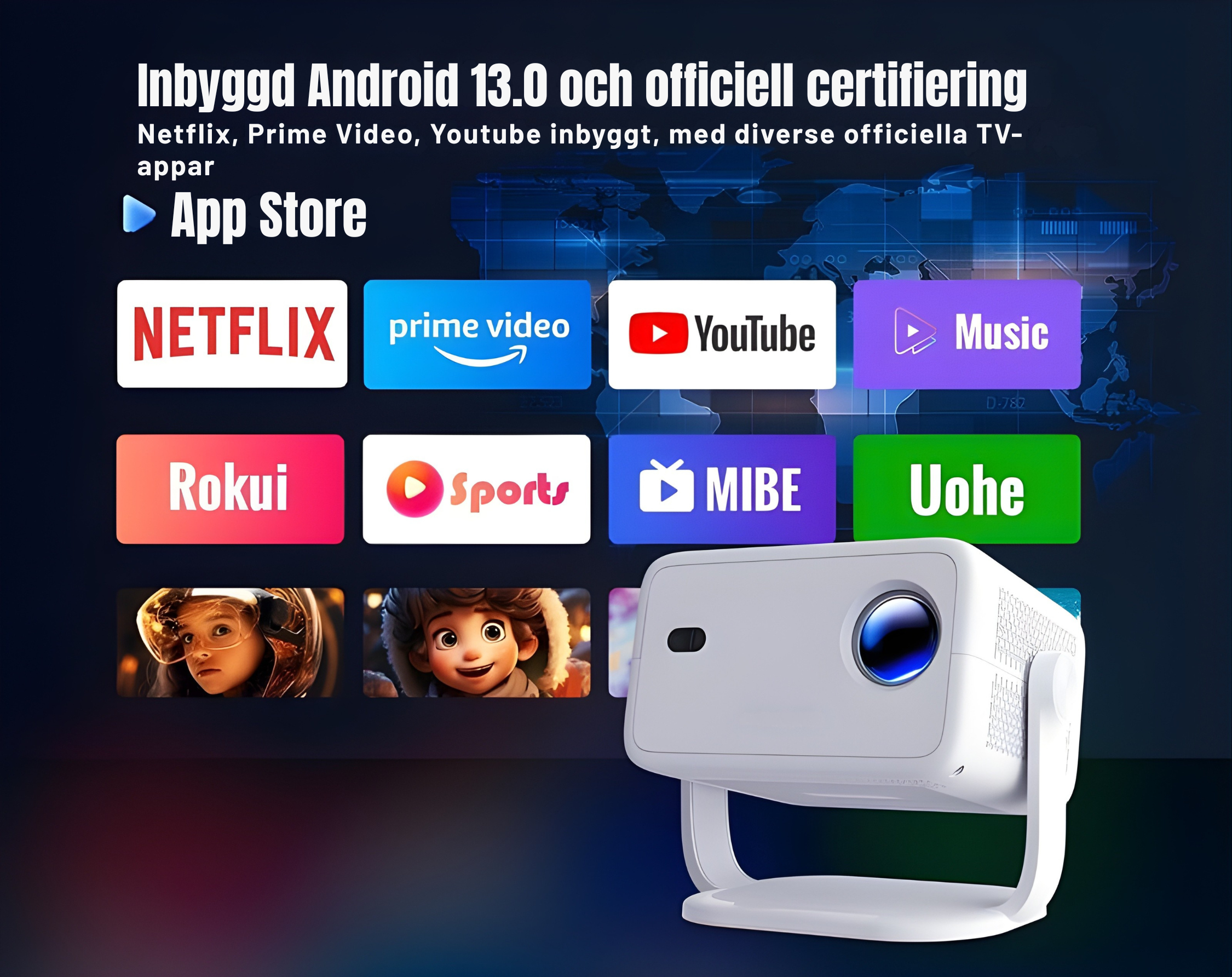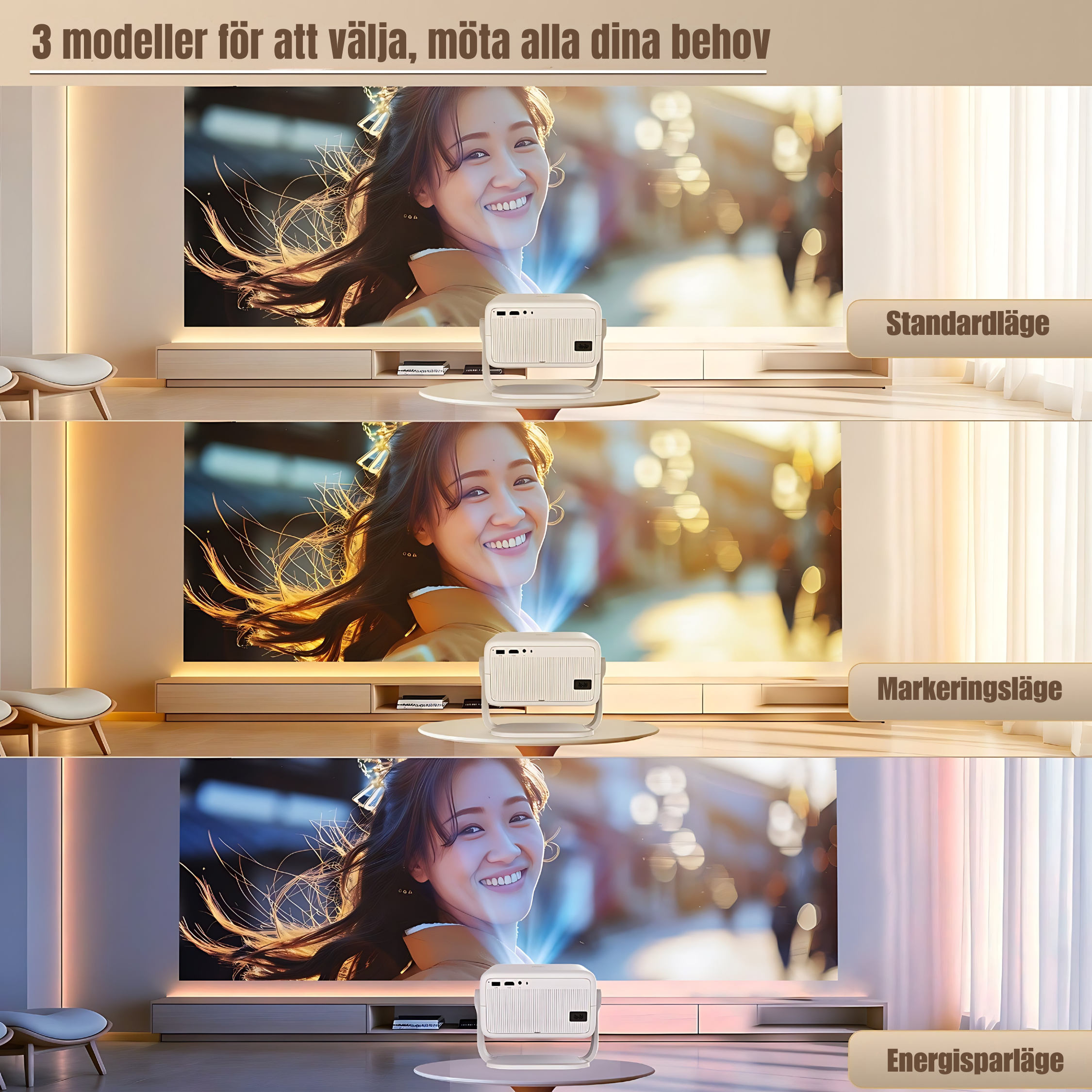Våra projektorer är plug-and-play. Du behöver bara koppla in ström. Alla modeller har inbyggd WiFi och appar, så du kan streama direkt utan extra utrustning