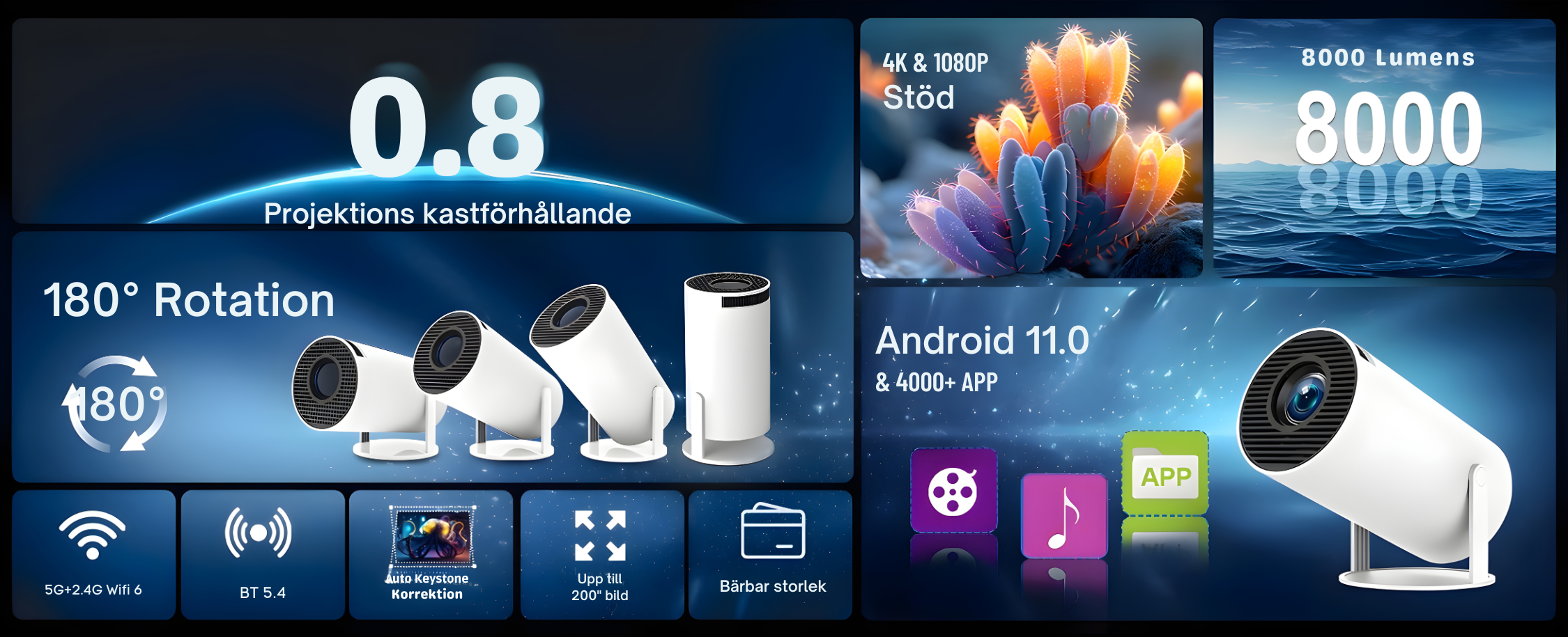Upplösning: XGA (1024×768), stödjer 1080P, 2K och 4K-signal